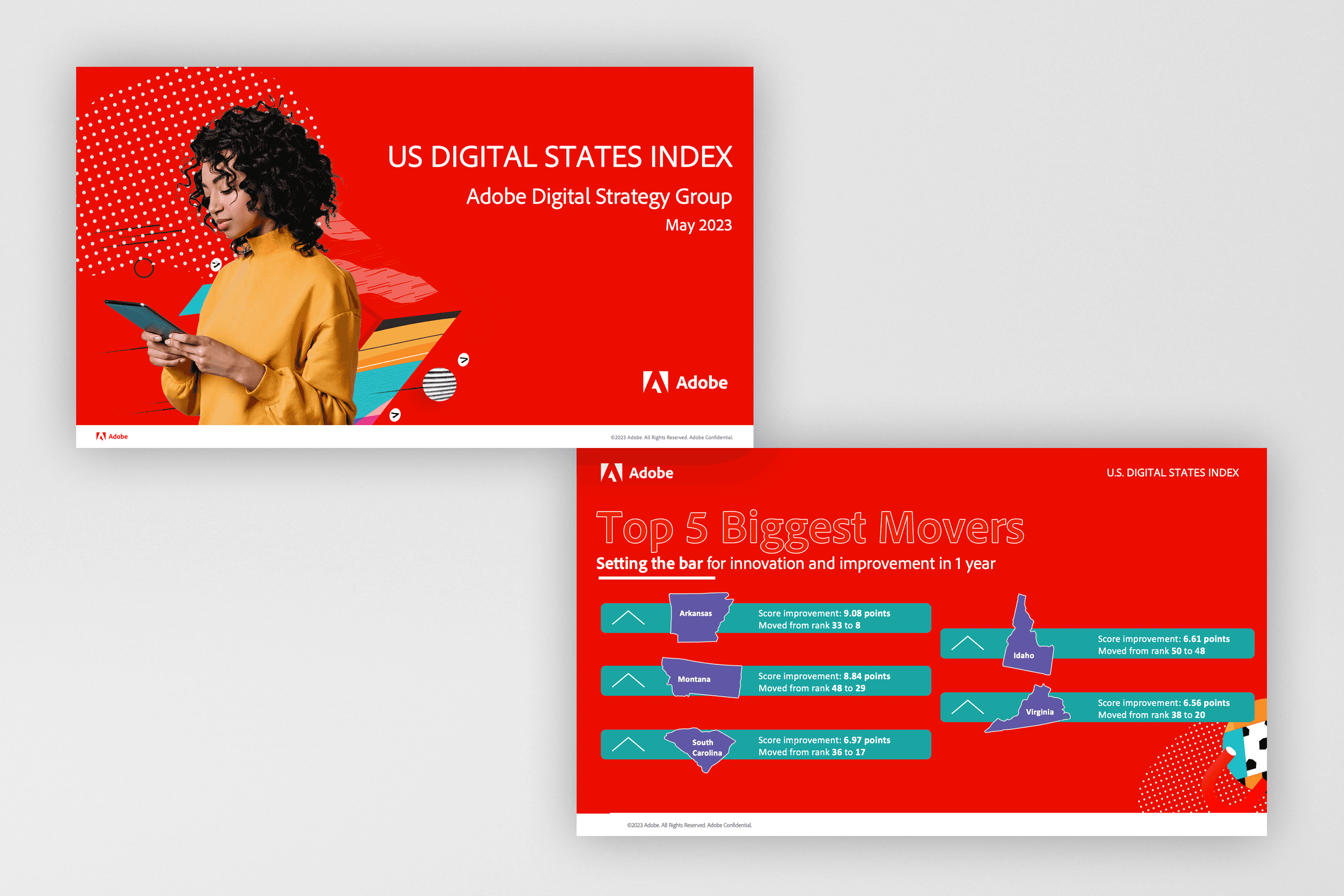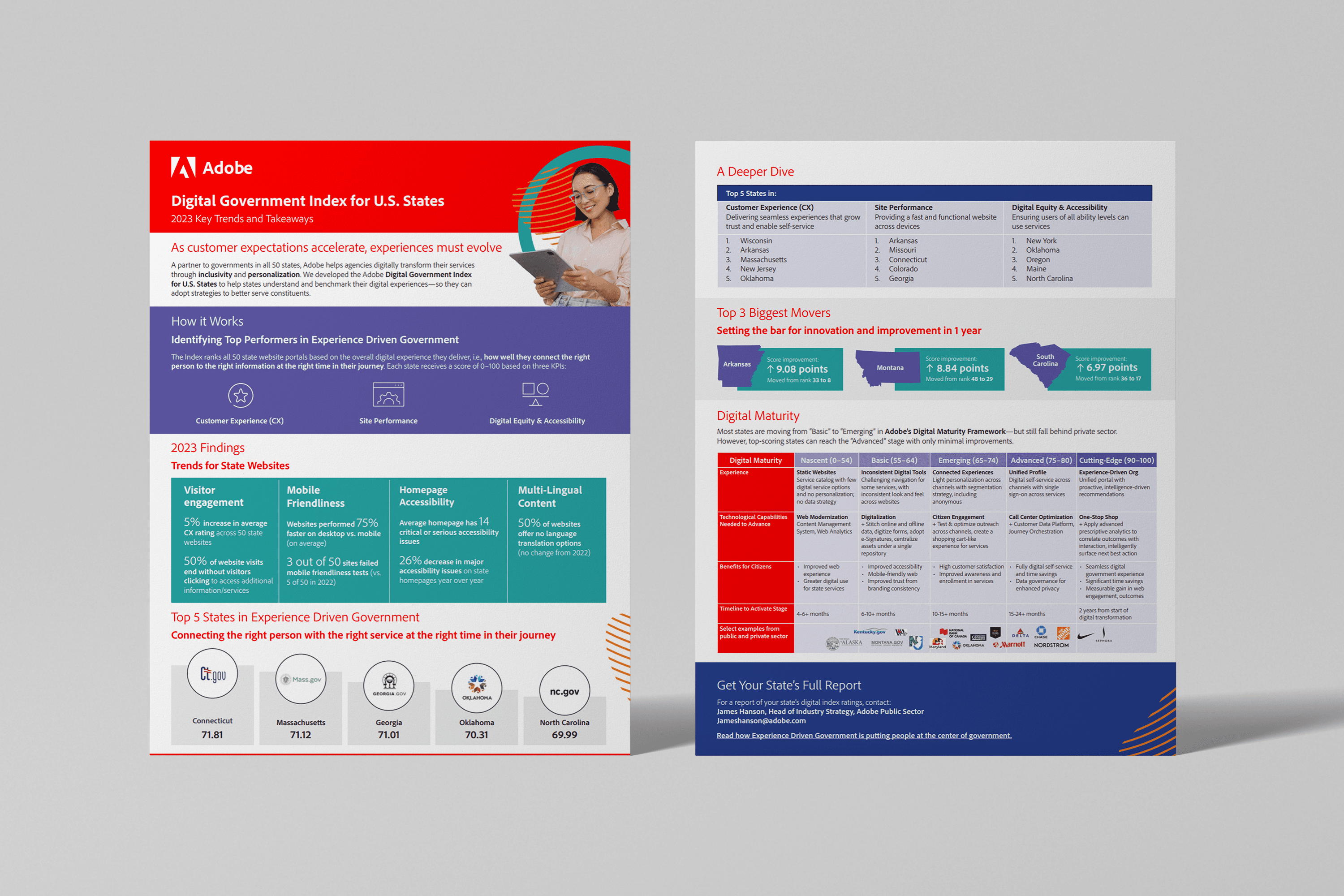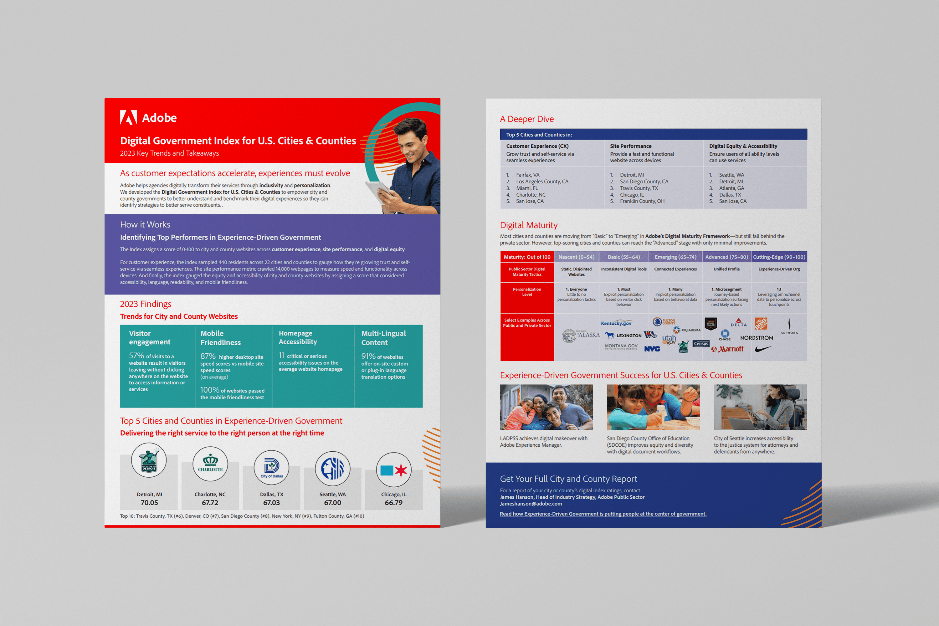 When Adobe extended the research to cities and counties, we adapted the system seamlessly — same design language, new content, municipal audience. The visual consistency across both initiatives reinforced Adobe's position as the authority on government digital maturity.