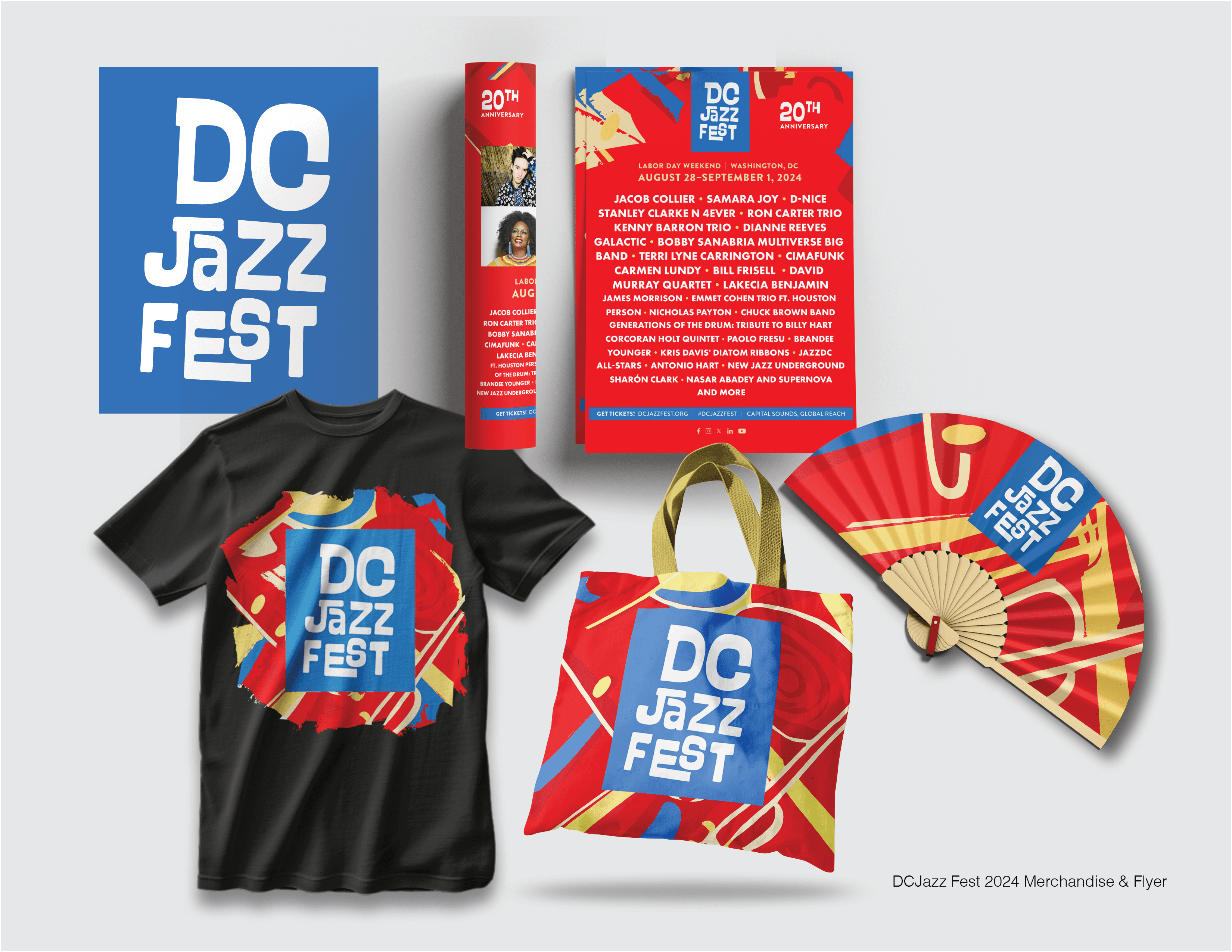 Most festivals have one visual identity. DC JazzFest needs a new one every year — fresh enough to feel current, consistent enough to feel like the same festival, and flexible enough to work across everything from a stage banner at The Wharf to a t-shirt, a social carousel, a program guide, and a coloring book for kids.