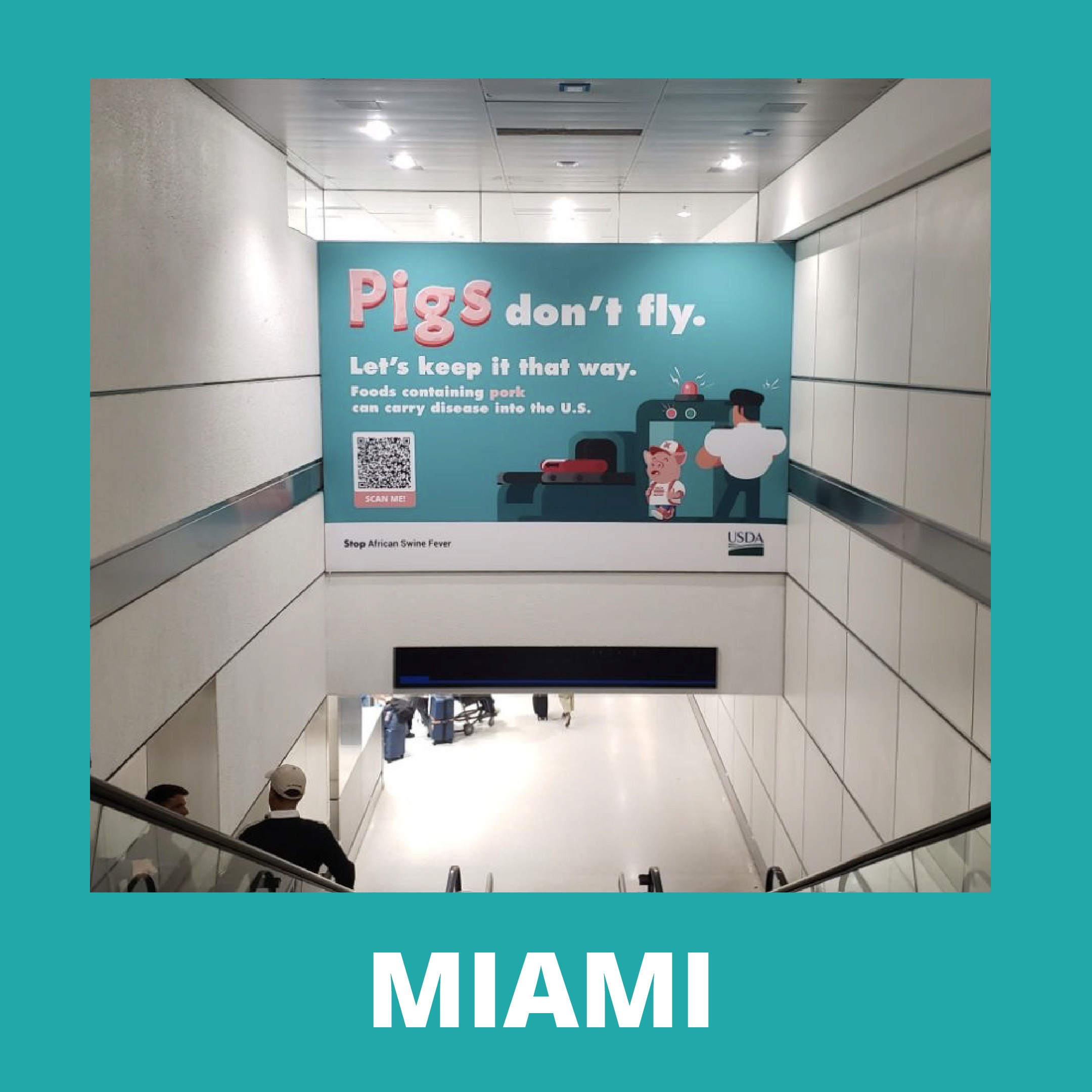 We led with humor instead of fear. "Pigs Don't Fly" turned a complex agricultural risk into a simple, memorable idea — a cartoon pig navigating an airport, showing up where real travelers would see it: airport terminals, social feeds, digital displays, video, and radio.